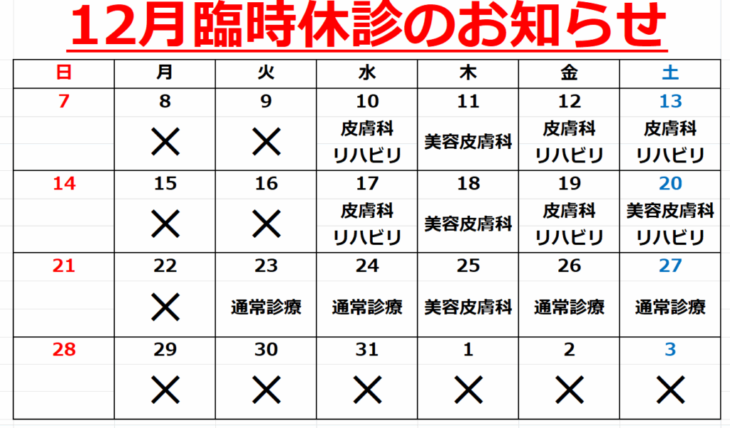 12月臨時休診のお知らせ 2025.11.18 12月の臨時休診のお知らせです。11月中に余裕をもって定期薬を揃えて頂けるようにご注意ください。 ※ 12/8(月)~12/22(月)は院長休診です。 ※ 12/28(日)~1/4(日)はお正月休みです。 なお、電気リハビリ治療、定期処方などの継続加療は受付します。 皮膚科は通常診療です。 ご迷惑をおかけしますが、ご理解のほど、よろしくお願いいたします。 院長 扇谷一郎 11月26日(水)皮膚科のみ休診のお知らせ 前の記事 帯状疱疹のワクチン接種ができます 次の記事